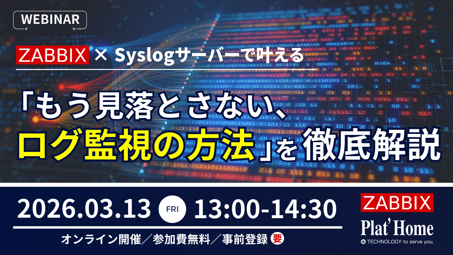 3/13(金)【Zabbix × ぷらっとホーム 共催】Zabbix × Syslogサーバーで叶える「もう見落とさない、ログ監視の方法」を徹底解説ウェビナーのご紹介