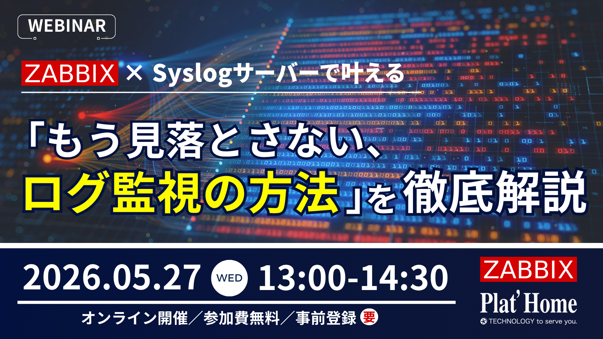 5/27(水)【Zabbix × ぷらっとホーム 共催】Zabbix × Syslogサーバーで叶える「もう見落とさない、ログ監視の方法」を徹底解説ウェビナーのご紹介